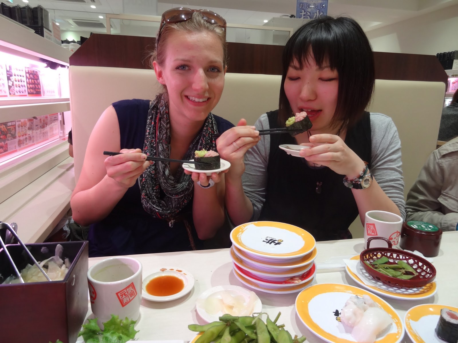 Another wonderful thing was that I was able to meet up with Haruna, my friend I'd met in Cambodia last August who lives just outside of Tokyo! She got along so well with the other volunteers and we had a great time exploring Shibuya all together. We had dinner at a kuru kuru sushi restaurant, conveyor belt style where you order on screen and the sushi is shuttled to your table. Amazing! Such a good experience...and so cheap!