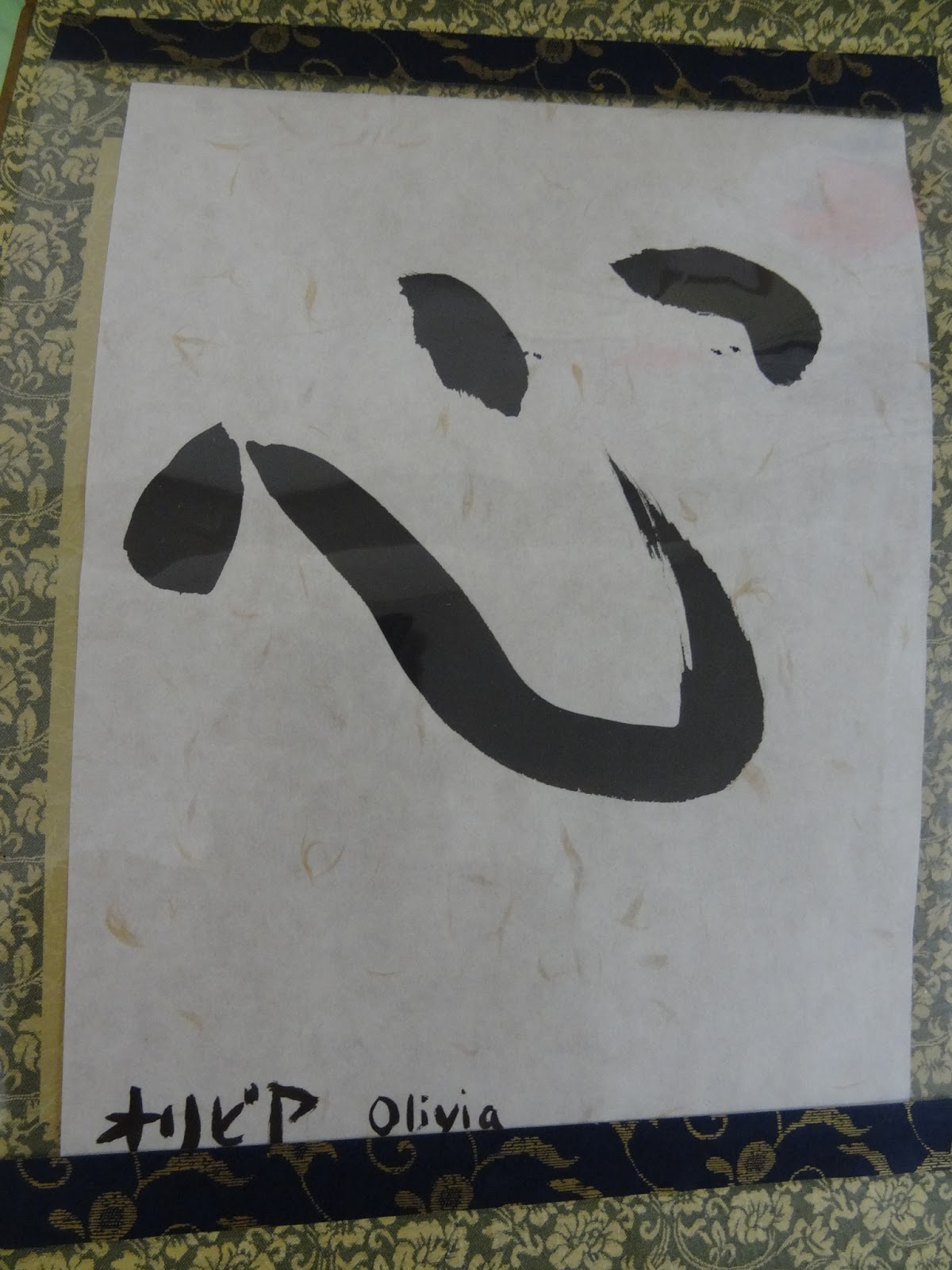 Today, Samantha, Ken and I took a Shodou class at the hospital. Shodou is Japanese art of calligraphy using paintbrush (fude) and ink on thin mulberry paper (washi). We had to chance to make our own ink by grinding the inkstick (sumi) against the inkstone (suzuri). We only spent a couple minutes doing this before switching to pre-made ink because to produce proper ink takes about an hour. The class was excellent. There is so much more to the art of calligraphy than I'd previously thought. Shodou has links to Zen Buddhism and revolves very closely around meditation and finding zen while producing pieces of art. So much so, that the class is actually used as a therapeutic technique in the psychiatric ward of the hospital. We were told to hold the brush and paint. And to just let ourselves paint, to not over think Well...I don't know any Kanji (Chinese characters of the Japanese written language) anyways, so that worked out. Then we were asked to draw the Kanji for heart/mind/spirit; kokoro. The point was to paint with your heart and produce whatever it is that you produce. After I'd finished, the Shodou sensei took my paper away and said "Do it again. You didn't paint with your heart." Oops, guess I was trying too hard to sort out how to shape the strokes instead of allowing it to simply flow out onto the page. Regardless, it ended up being a really nice class and I plan on going back again as soon as I can. :)