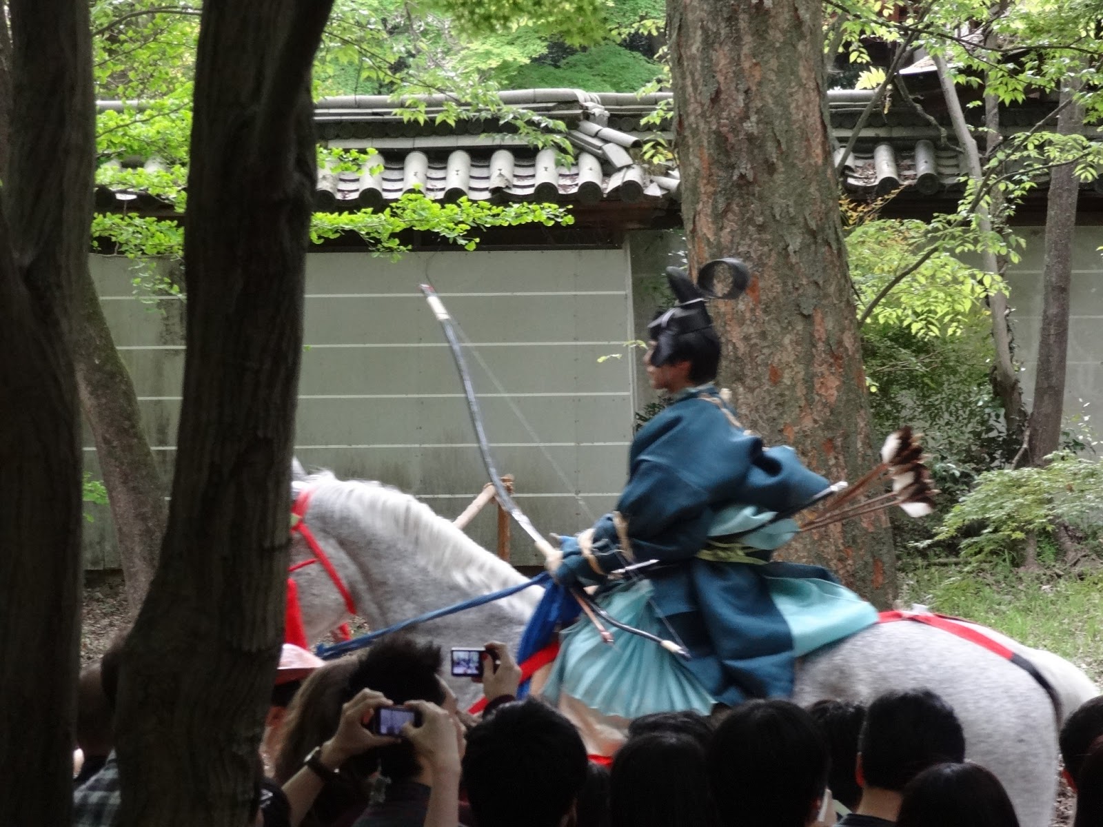 We first took off to Fushimi-Inari Taisha Shrine, the unbelievable shine composed of thousands of orange torii gates, all donated by Japanese businesses, that form a walk way up the mountain to the main temple area. If you've seen "Memoirs of a Geisha", you'll recognize this place. It quickly became one of my favourite places I've visited in Japan without considering the great blessing O-mikuji that I received at the shrine. lucky me! We caught a parade on the way out of the shrine area as we rode our bikes towards Shimogamo Shrine for Yabusame, traditional Japanese horseback archery!