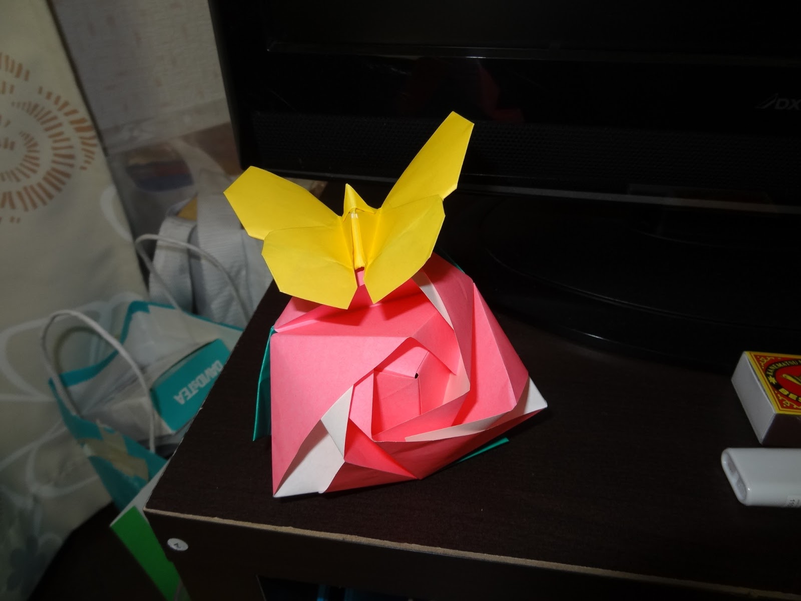 This weekend I also worked on my origami skills. I chose a very difficult one that required 6 pieces of paper. It was initially a cube, but opened up into what I am proud to say does actually look like a rose. I then made a butterfly to sit on it. I showed a few people and got a shocked face and a "sugoi!" "Amazing!" for it. :)