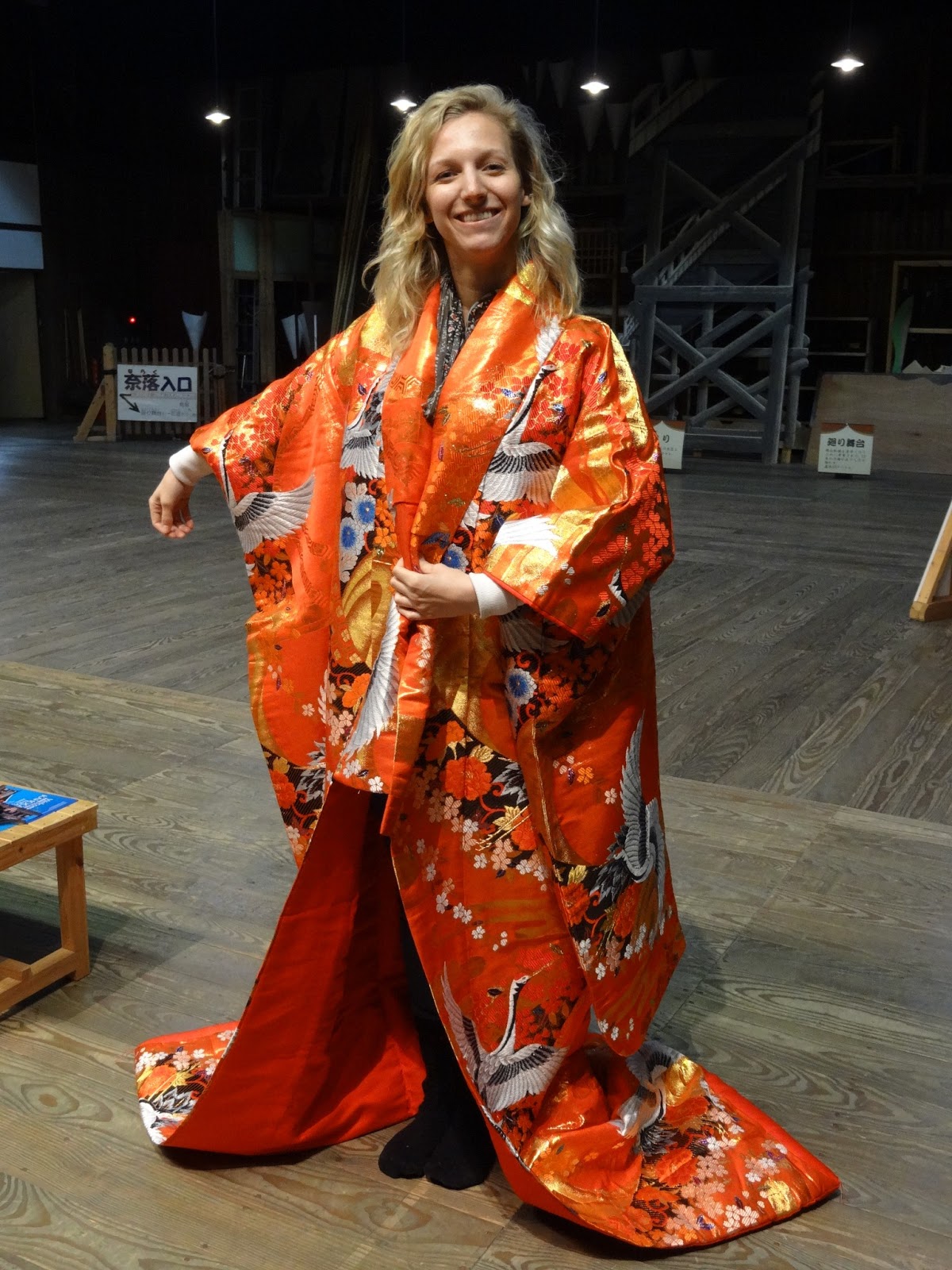 After our lesson, we walked to a traditional Japanese theater, the Kaho Gekijo Kabuki theater. It is the only two story kabuki theater in Japan that continues to make use of the original building! This picture was from the stage looking at the seating. The building can hold over 1,200 people who sit on tatami mats and traditional Japanese pillows. On the right of the picture, you can just make out the part of the stage that rotates. 26 people push from under the stage to rotate it. This is how they change scenes during the play! Amazing! Sugoi!